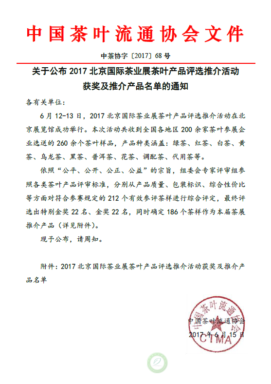关于公布2017北京国际茶业展茶叶产品评选推介活动获奖及推介产品名单的通知