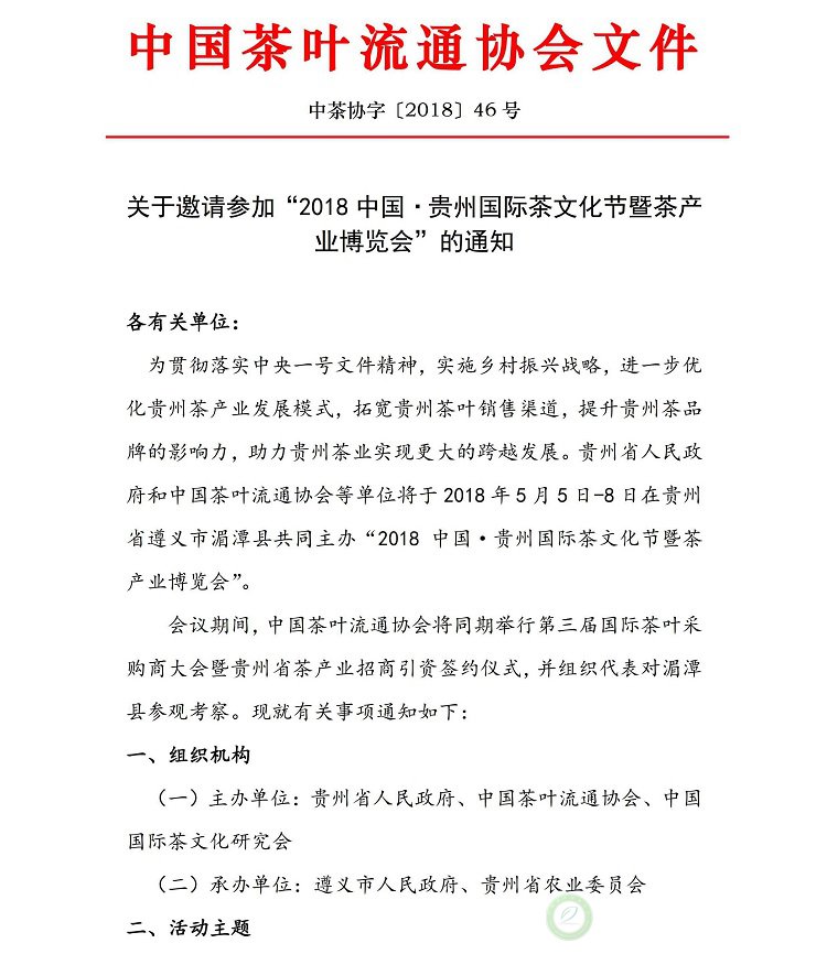 关于邀请参加“2018中国·贵州国际茶文化节暨茶产业博览会”的通知