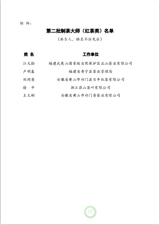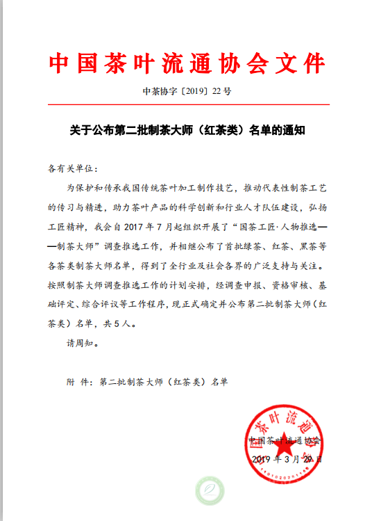 关于公布第二批制茶大师(红茶类)名单的通知