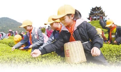 春茶进入全面采摘期,湖北恩施土家族苗族自治州宣恩县,300多名小学生日前来到万寨乡伍家台村,体验采茶乐趣。