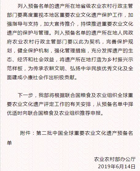 日前,农业农村部办公厅关于公布第二批中国全球重要农业文化遗产预备名单的通知,确定将天津滨海崔庄古冬枣园等36个传统农业系统列入第二批中国全球重要农业文化遗产预备名单,其中包含6个茶文化系统,分别是:福建安溪铁观音茶文化系统,福建福鼎白茶文化系统、湖北恩施玉露茶文化系统、湖北赤壁羊楼洞砖茶文化系统、贵州花溪古茶树与茶文化系统、云南双江勐库古茶园与茶文化系统。(排名不分先后)