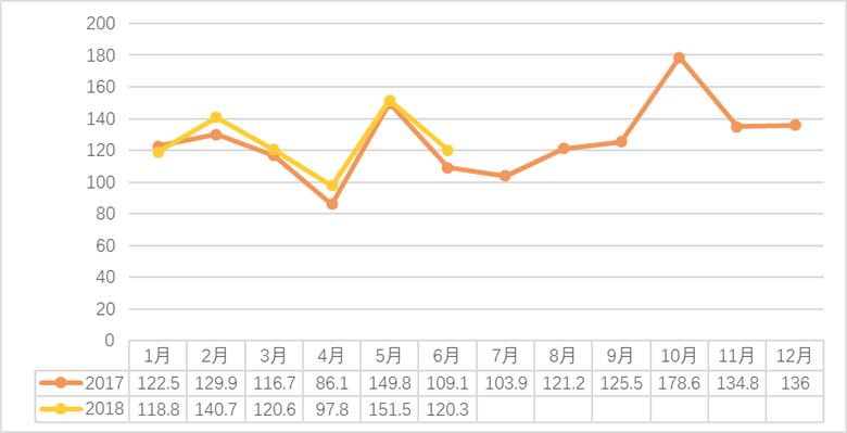 持续受安溪县今年初以来推行的全面整治压制茶,部分茶园不采摘进行留养,鼓励低海拔、低效益茶园退耕还林的影响,2018年6月份安溪中国茶都市场交易量与去年同期相比有小幅下降;虽然市场在售鲜叶有所减少,但市场对鲜叶需求热度不减,在此情况下,本月铁观音市场交易成交价格较去年有所上升,带动成交总额不减反升。