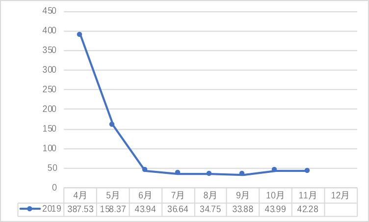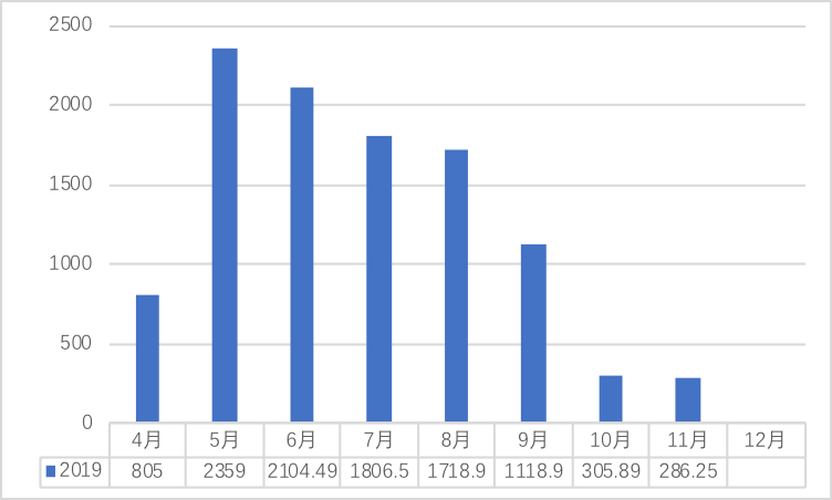 2019年(4月)-2019(11月)五峰西南茶叶市场交易量(吨)