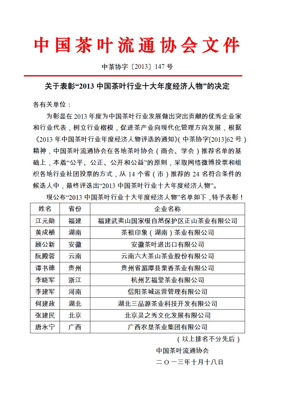 回顾:关于表彰“2013年中国茶叶行业年度十大经济人物”的决定