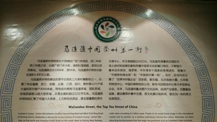 作为“中国茶叶第一街”,“马连道”品牌在中国茶产业中的地位和优势日益突出。经过多年的培育和发展,马连道地区已集聚了全国六大茶类、上万种名优茶,集中了马连道茶城、国际茶城等12个大型茶城,总营业面积超过22万平方米,云集国内福建、安徽、浙江、江西、四川、贵州等12个产茶大省的茶企业3000余家,茶业为主的行业协会、商会10余家。目前,街区年销售额超过42亿元,约占全国茶叶年交易额的十分之一,是全国著名的三大茶叶集散地之一。