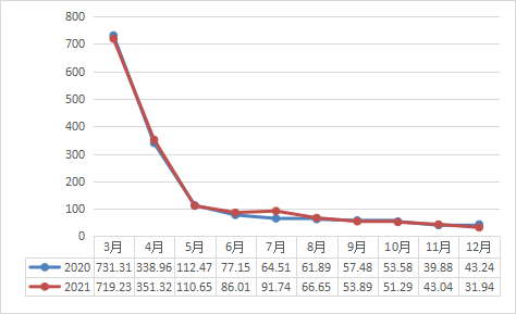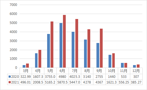 2020年(3月)-2021(12月)五峰西南茶叶市场交易量(吨)