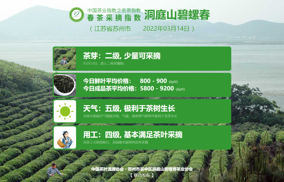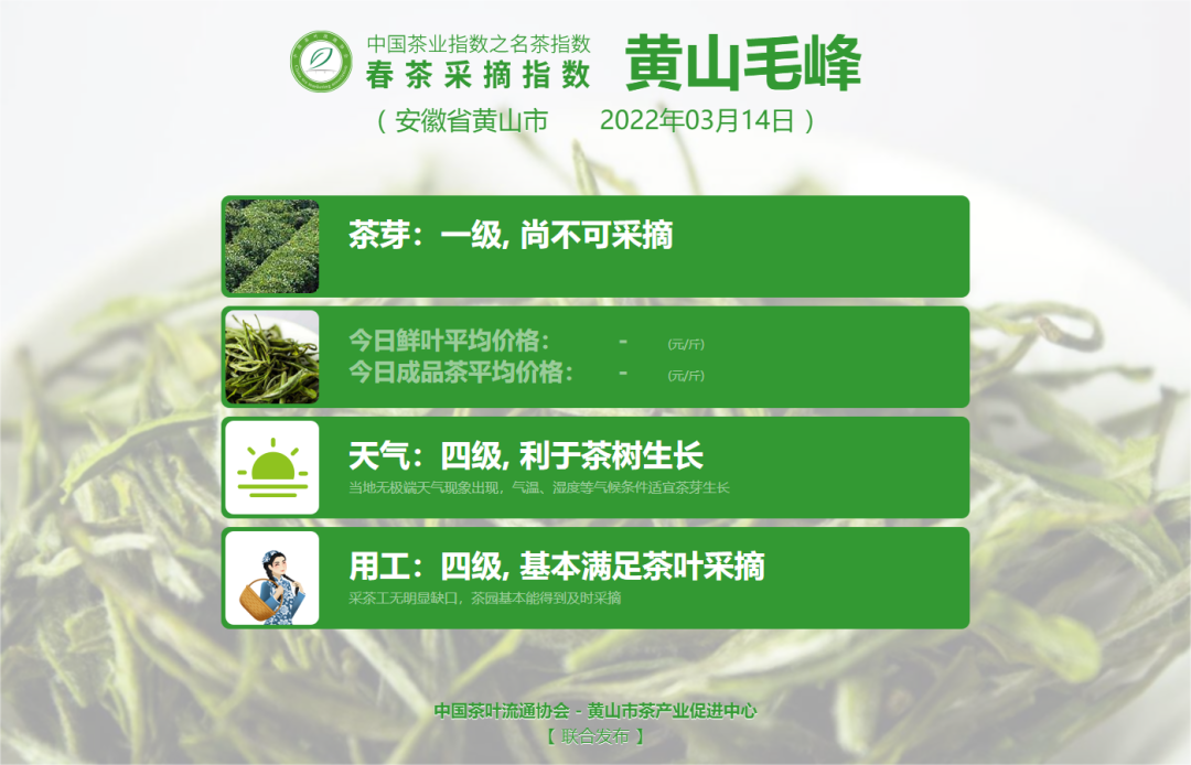 为引导广大茶叶消费者科学、安全、理性选购,切实保护名茶原产地生产者和广大消费者的利益,中国茶叶流通协会于2022年继续联合杭州市西湖区龙井茶产业协会等9大名茶产区主管单位于即日起共同发布中国茶业指数之名茶指数——春茶采摘指数(简称:春茶采摘指数)。包括西湖龙井、洞庭山碧螺春、黄山毛峰、信阳毛尖、六安瓜片、太平猴魁、湄潭翠芽、大佛龙井与武夷岩茶。