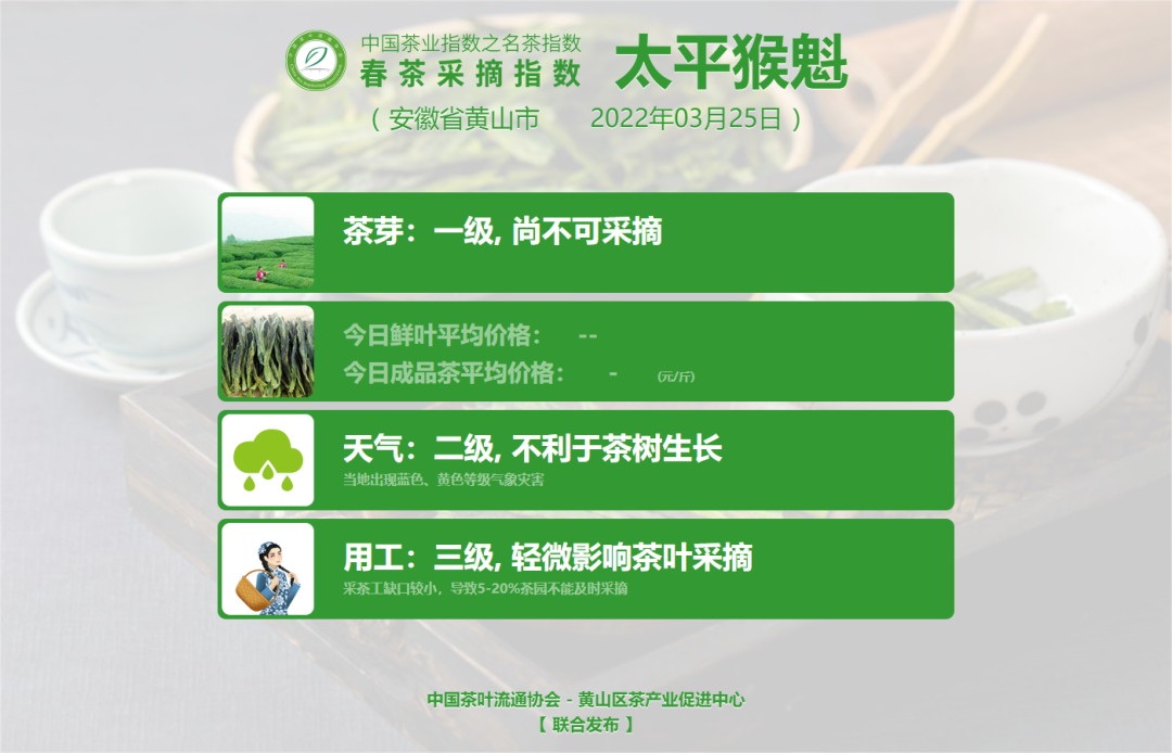 为引导广大茶叶消费者科学、安全、理性选购,切实保护名茶原产地生产者和广大消费者的利益,中国茶叶流通协会于2022年继续联合杭州市西湖区龙井茶产业协会等9大名茶产区主管单位于即日起共同发布中国茶业指数之名茶指数——春茶采摘指数(简称:春茶采摘指数)。包括西湖龙井、洞庭山碧螺春、黄山毛峰、信阳毛尖、六安瓜片、太平猴魁、湄潭翠芽、大佛龙井与武夷岩茶。