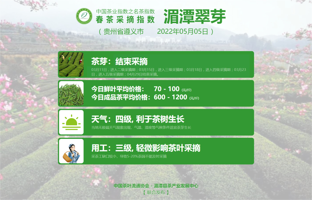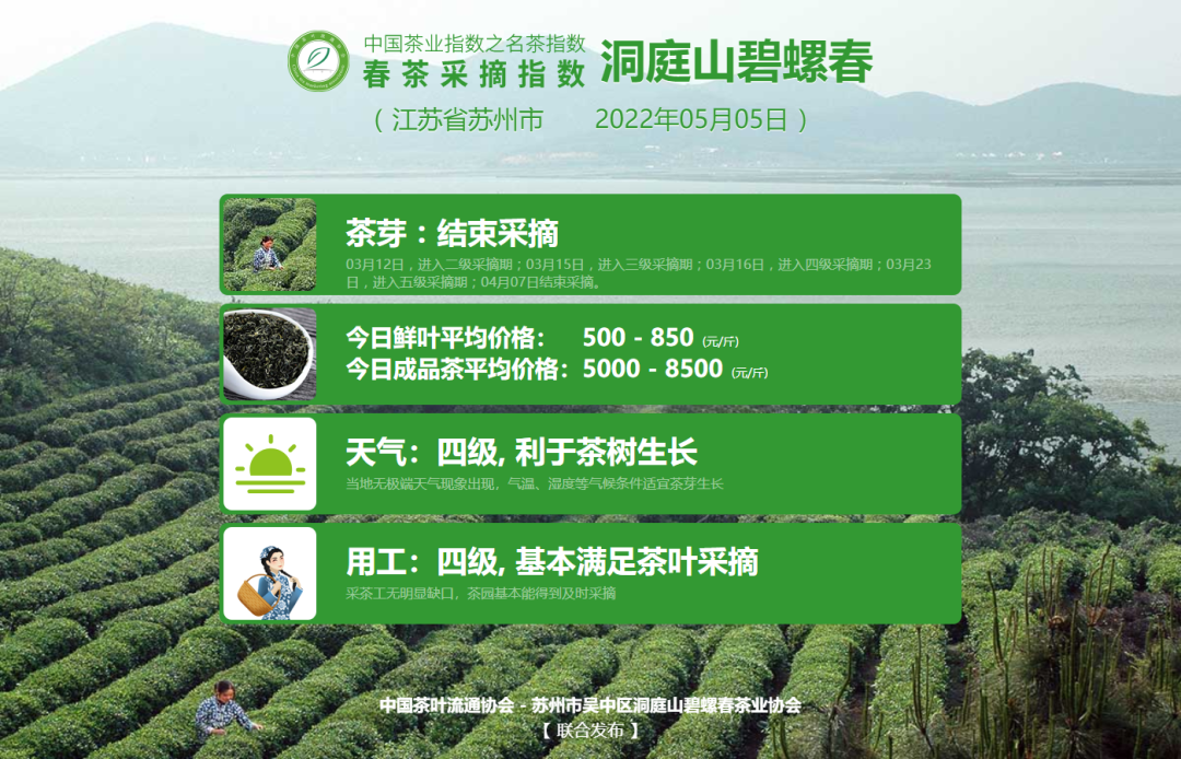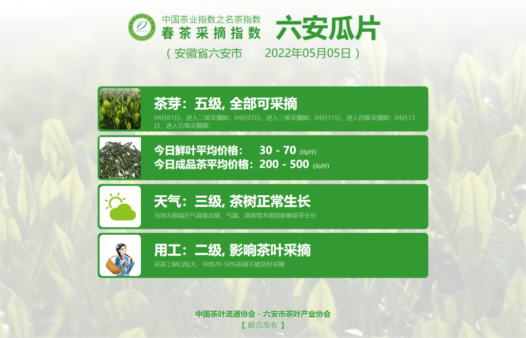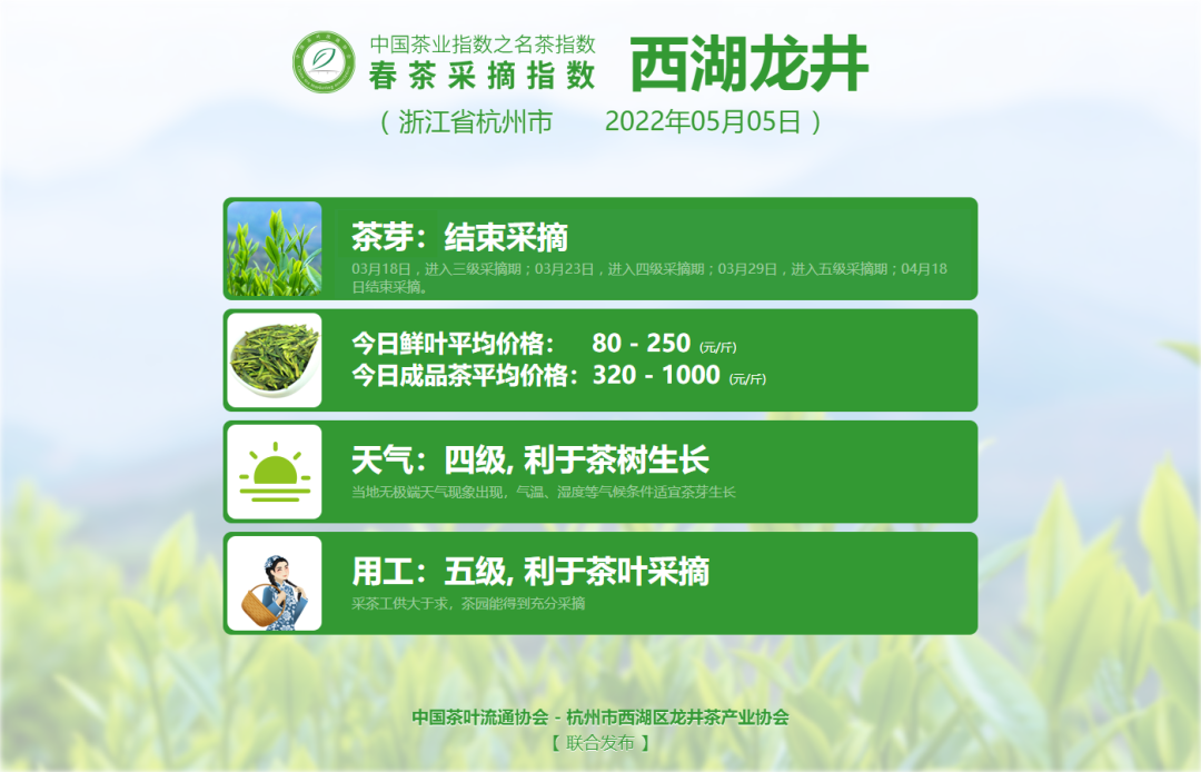 为引导广大茶叶消费者科学、安全、理性选购,切实保护名茶原产地生产者和广大消费者的利益,中国茶叶流通协会于2022年继续联合杭州市西湖区龙井茶产业协会等9大名茶产区主管单位于即日起共同发布中国茶业指数之名茶指数——春茶采摘指数(简称:春茶采摘指数)。包括西湖龙井、洞庭山碧螺春、黄山毛峰、信阳毛尖、六安瓜片、太平猴魁、湄潭翠芽、大佛龙井与武夷岩茶。