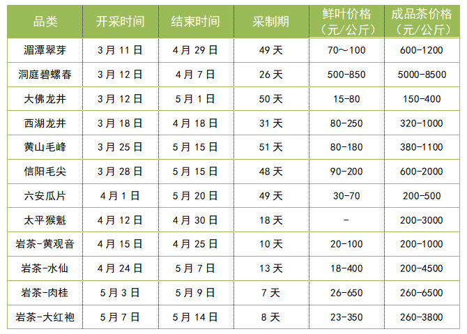 采摘时间方面,各品类名茶开采时间少有推迟,采制周期有所缩短;