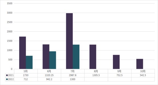 2022年6月横州茉莉花茶平均价格对比去年同期上市价格有所下降,原因是6月份雨水天气居多,而茉莉花花苞小,鲜花产量低,鲜花利用率低,茉莉花茶交易量也随之减少。