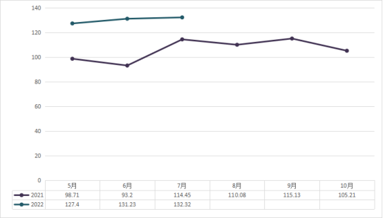 2022年6月横州茉莉花茶(成品茶)价格指数为131.23;6月茉莉花茶(成品茶)价格为71元/kg,比去年同期的93.2元/kg减少了22.2元/kg,比去年同期减少24%。交易量942.2吨,比去年同期的1320.25吨减少378.05吨,减少29%。(以上采样数字采自横州西南茶城莉花交易市场、中国茉莉小镇'石井茉莉花交易市场交易量情况及社会抽查结果)。