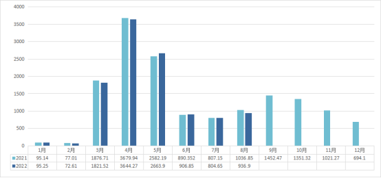 2021-2022(8月)新昌中国茶市交易量(吨)
