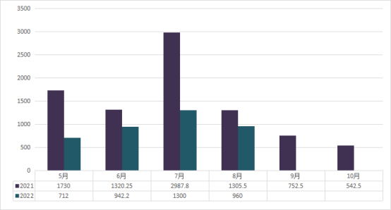 2022年8月横州茉莉花茶平均价格对比去年同期上市价格有所上升,8月份干旱,可利用花减少,鲜花需求量大,故茉莉花茶平均价格有所上升。受疫情影响,茉莉花茶交易量对比去年同期有所下降。