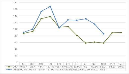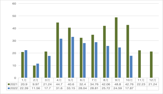三、10月份市场销售量为17.866吨,较9月市场销量的24.589吨相比下降了6.723吨,同比下降了27个百分点。