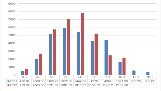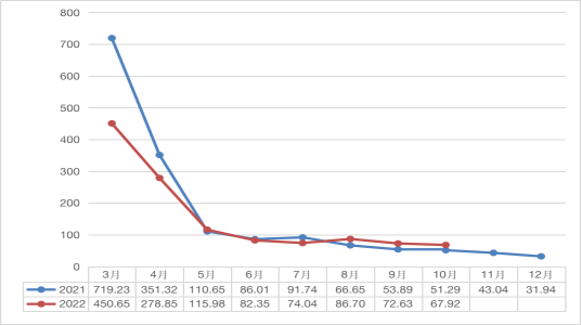 一、茶叶交易淡季,交易趋于平稳。10月市场交易量较9月降低308.61吨,降幅12.5%,市场交易额较九月降低2080.15万元,降幅18.19%,茶叶平均售价高于2021年同期,茶叶价格有所提升。