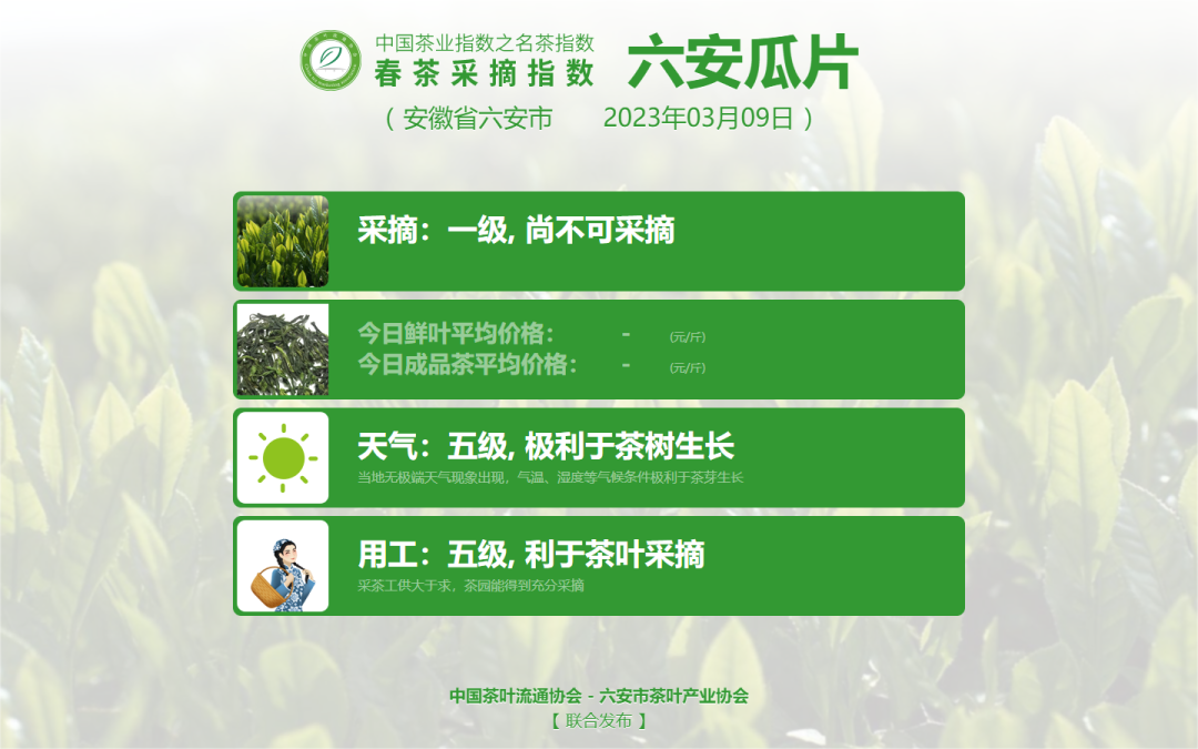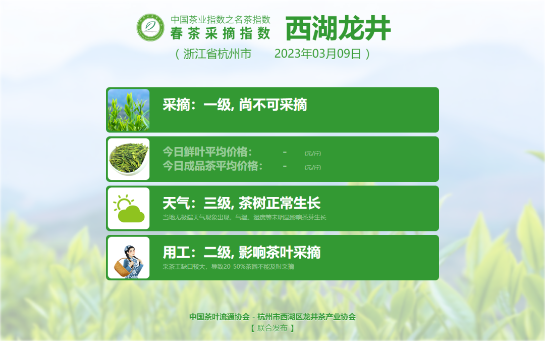 敬请持续关注中国茶叶流通协会官网及微信公众号,获取2023春茶采摘指数每日最新变化。