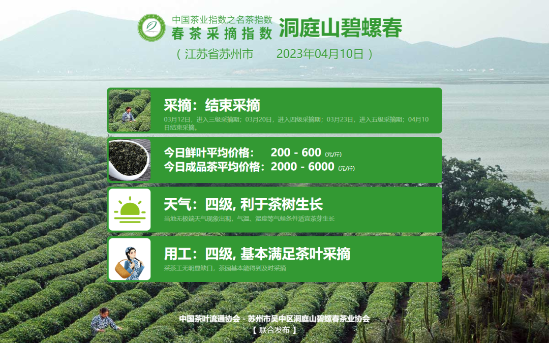 洞庭山碧螺春于3月12日正式开采,进入三级采摘期;3月20日起进入四级采摘期;3月23日起进入五级采摘期。根据GB18957洞庭山碧螺春国家标准,洞庭山碧螺春只采摘到一芽二叶为止,至4月10日,2023年洞庭山碧螺春采摘期结束。从4月11日起,苏州太湖洞庭东西山全面进入手工炒青制作阶段,我们也将停止更新洞庭山碧螺春鲜叶采摘情况。