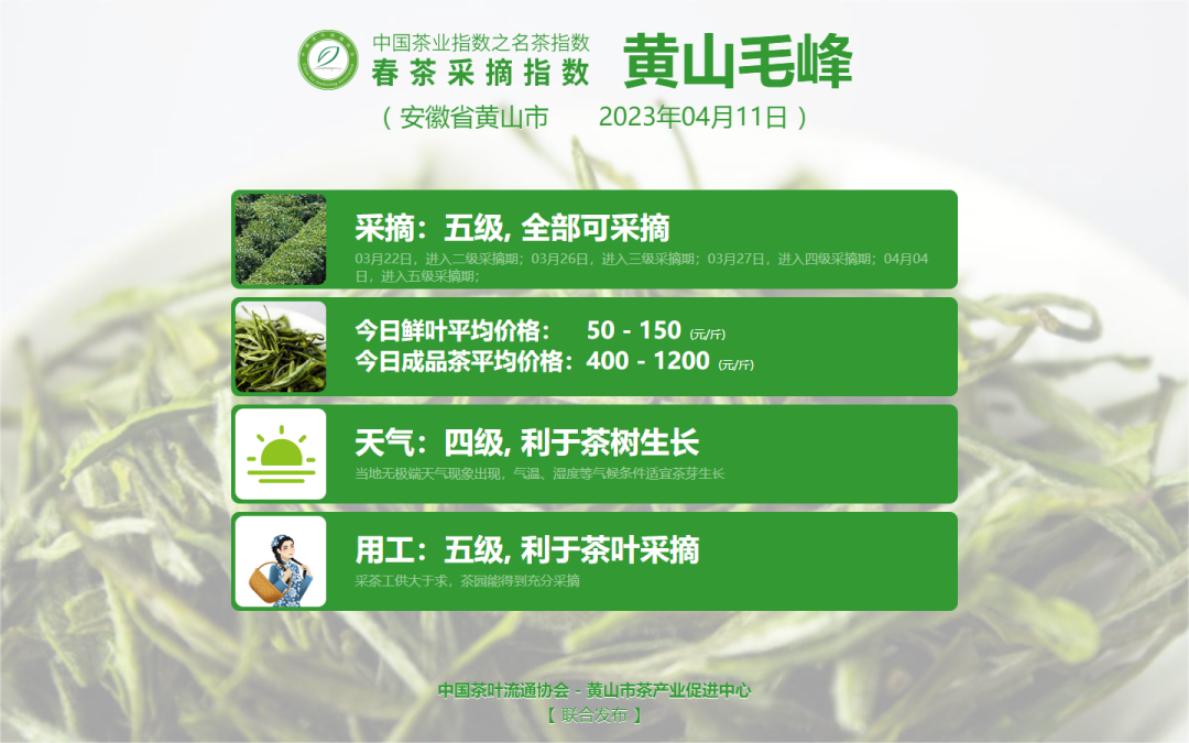 茶芽方面,西湖龙井、洞庭山碧螺春、湄潭翠芽、黄山毛峰、大佛龙井、信阳毛尖、六安瓜片均已进入五级(全部可采摘),太平猴魁、武夷岩茶、安溪铁观音等暂未开采。