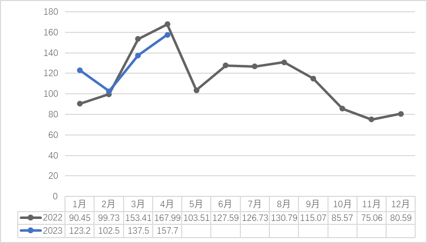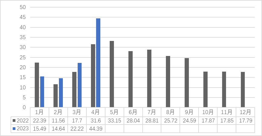 三、4月份市场销售量为44.39吨,较去年同期市场销量的31.57吨相比上涨了12.82吨,同比增长40.6%。
