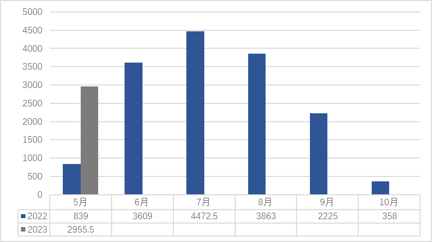 2023年5月横州茉茉莉花的交易量对比去年同期增加252%。原因是:今年5月份阳光较去年相对猛烈,,导致茉莉花出花率比去年猛长,茉莉花出花量也增加,交易量随之增加。