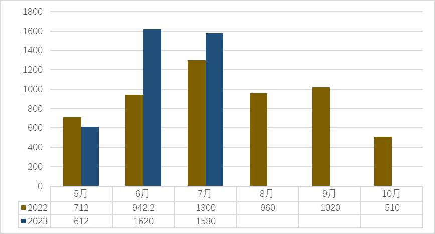 2023年7月横州茉莉花茶平均价格与比去年同期持平,7月天气晴朗、光照充足,但出花率不是很高,茉莉鲜花交易量减少,所以茉莉花茶交易量也随之减少。