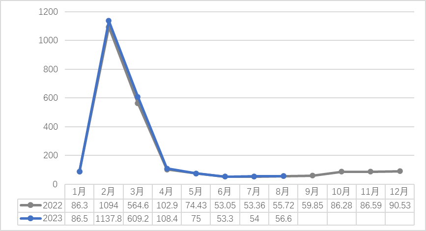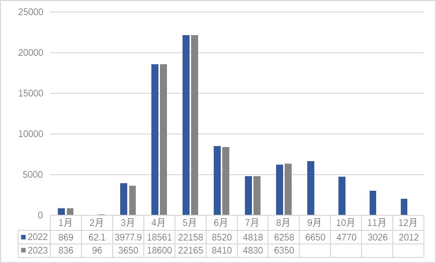 2022-2023(8月)浙南茶叶市场交易量(吨)