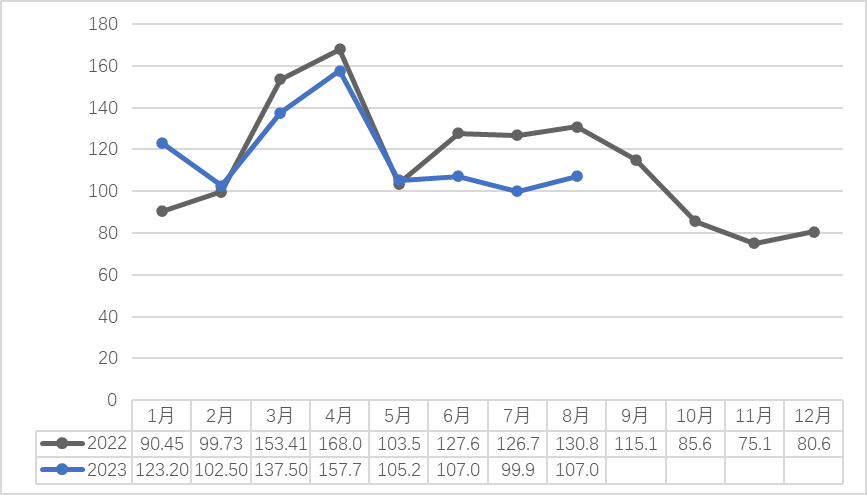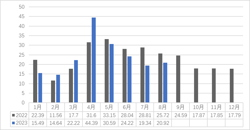 三、8月份市场销售量为20.92吨,较去年同期市场销量的25.71吨相比下降了4.79吨,同比减少18.63%。