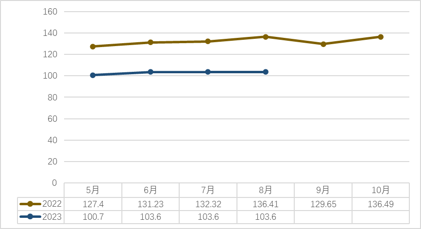 2023年8月横州茉莉花茶(成品茶)价格指数为103.6;8月茉莉花茶(成品茶)价格为72元/kg,与去年同期持平,交易量1120吨,比去年同期的1580吨减少460吨,减少29%,交易额8064万元。(以上采样数字采自横州西南茶城莉花交易市场、中国茉莉小镇'石井茉莉花交易市场交易量情况及社会抽查结果)。
