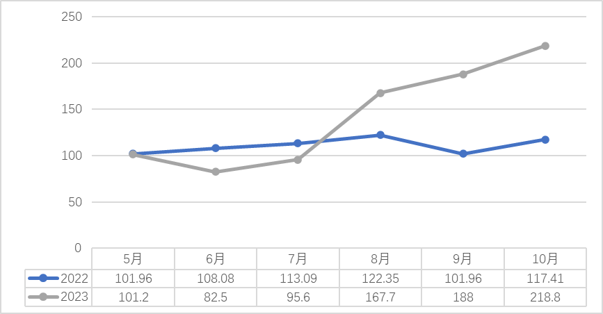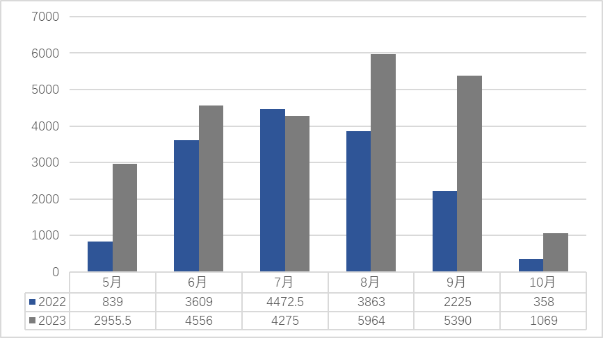 2023年10月,秋季横州市气温高,阳光充足,今年10月横州市茉莉花已经进入“秋花汛”,今年10月份茉莉花的产量对比去年同期稍微有所上升。茉莉鲜花平均价格对比去年同期翻了一番。原因有以下两点:一是现横州市茶商对花茶品牌意识的提高,开始注重花茶产品的质量,窨制茉莉花茶的用花量比往年高,对茉莉鲜花的需求量比往年大;二是市委市政府加大了对茉莉花产业的宣传力度,使得各地的采购商纷纷到横州市进行采购和代加工。10月茉莉鲜花品质较好,各茶商均纷纷抢购茉莉鲜花,因此抬高了茉莉花价格。由于茉莉鲜花价格的一路攀升,10月茉莉鲜花的成交额对比去年同期也随之增加。