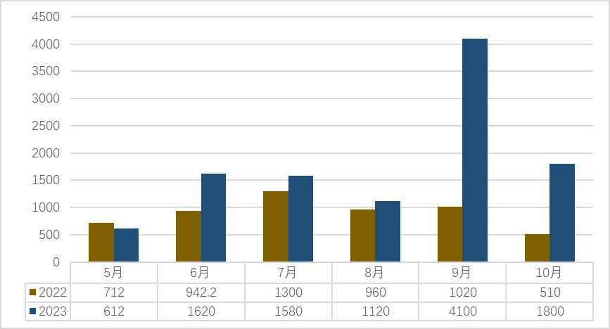 2023年10月横州茉莉花茶(成品茶)价格指数为103.6;10月茉莉花茶(成品茶)价格为72元/kg,与去年同期持平,交易量1800吨,比去年同期的510吨增加1290吨,增加253%。交易额1.296亿元。(以上采样数字采自横州西南茶城莉花交易市场、中国茉莉小镇'石井茉莉花交易市场交易量情况及社会抽查结果)。