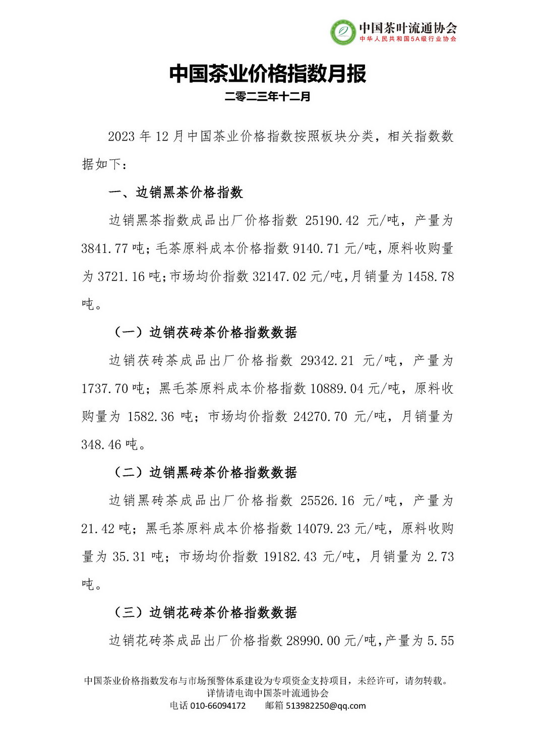 2023年12月中国茶业价格指数