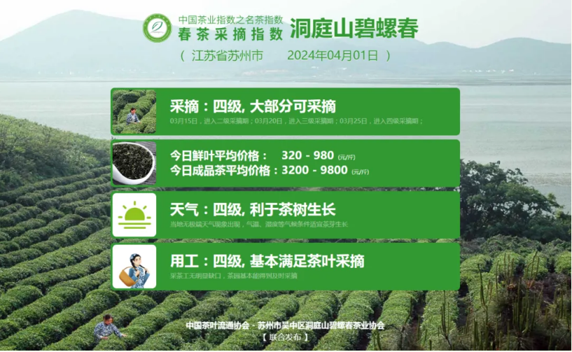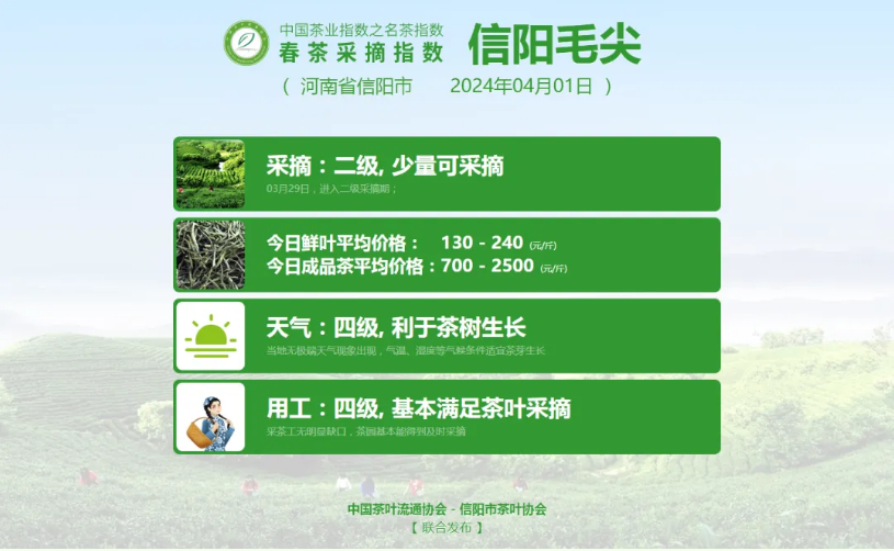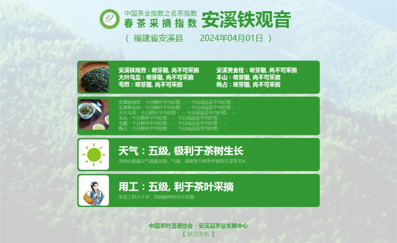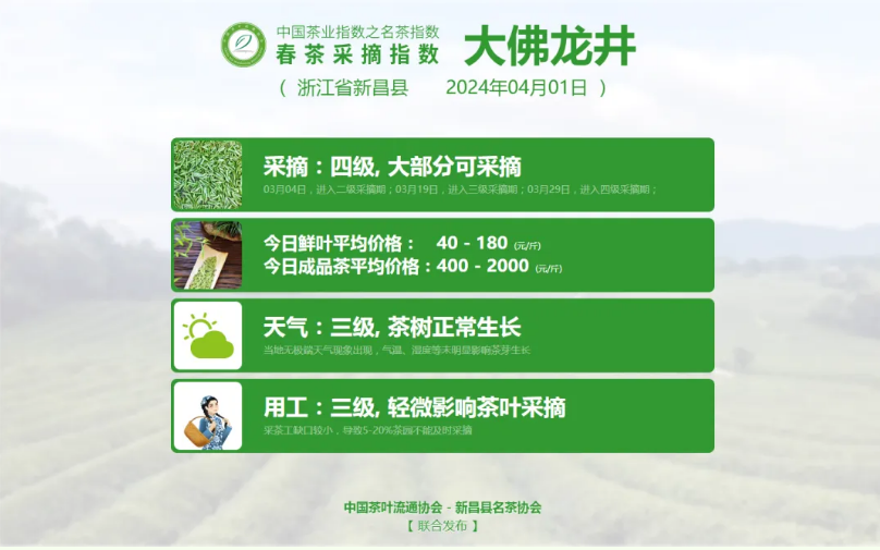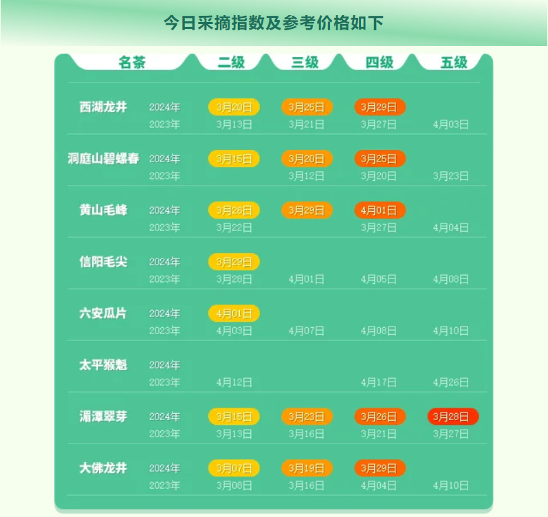 敬请持续关注中国茶叶流通协会官网及微信公众号,获取2024春茶采摘指数每日最新变化。