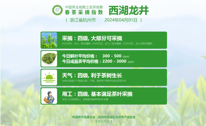 为引导广大茶叶消费者科学、安全、理性选购春茶,切实保护名茶原产地生产者和广大消费者的利益,中国茶叶流通协会于2024年继续联合杭州市西湖区龙井茶产业协会等10大名茶产区主管单位共同发布中国茶业指数之名茶指数——春茶采摘指数(简称:春茶采摘指数)。包括西湖龙井、洞庭山碧螺春、黄山毛峰、信阳毛尖、六安瓜片、太平猴魁、湄潭翠芽、大佛龙井、武夷岩茶与安溪铁观音。