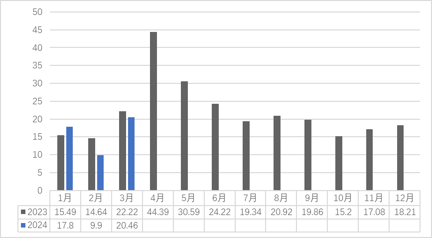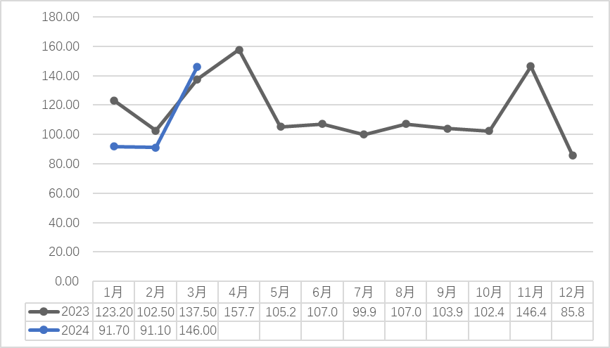 三、3月份市场单价为2995.1元/千克,较去年同期市场每公斤单价2534.5元相比减少了460.6元,同比上涨了18.17%。