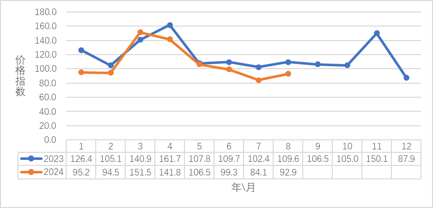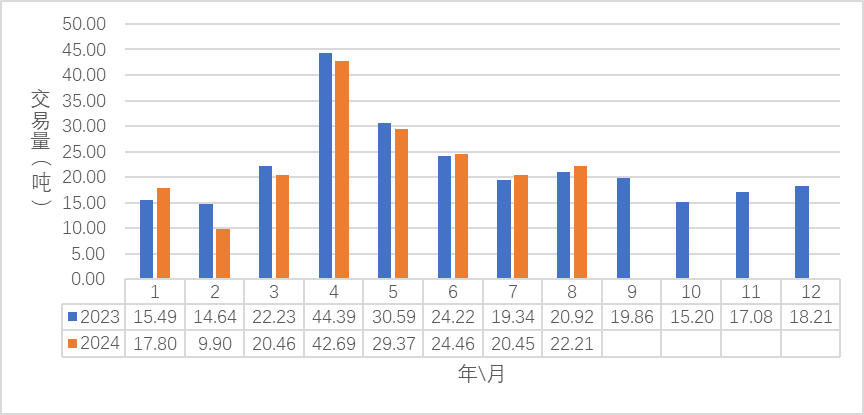八月市场单价为1837.65元/千克,较去年同期市场每公斤单价1972.33元相比下降了134.68元,同比下降了6.82%。