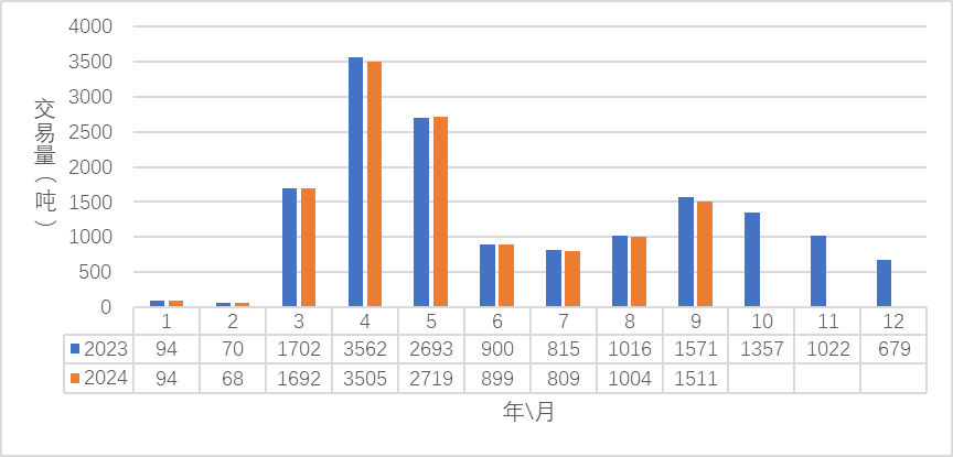 市场9月交易量1511329公斤,比去年同期1571316公斤下降3.82%;交易额31967.63万元,比去年同期32519.96万元,下降1.70%;平均价格211.52元/公斤,比去年同期206.96元/公斤增长了2.20%。9月价格指数55.3。