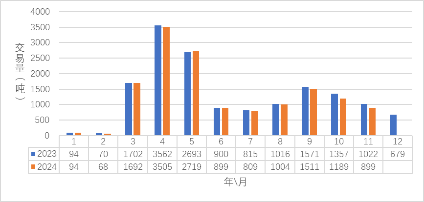 2024年1-11月,中国茶市交易总量为14387.40吨,比去年同期14811.78吨下降2.87%,交易总额58.81亿元,比去年同期60.21亿元下降2.32%。