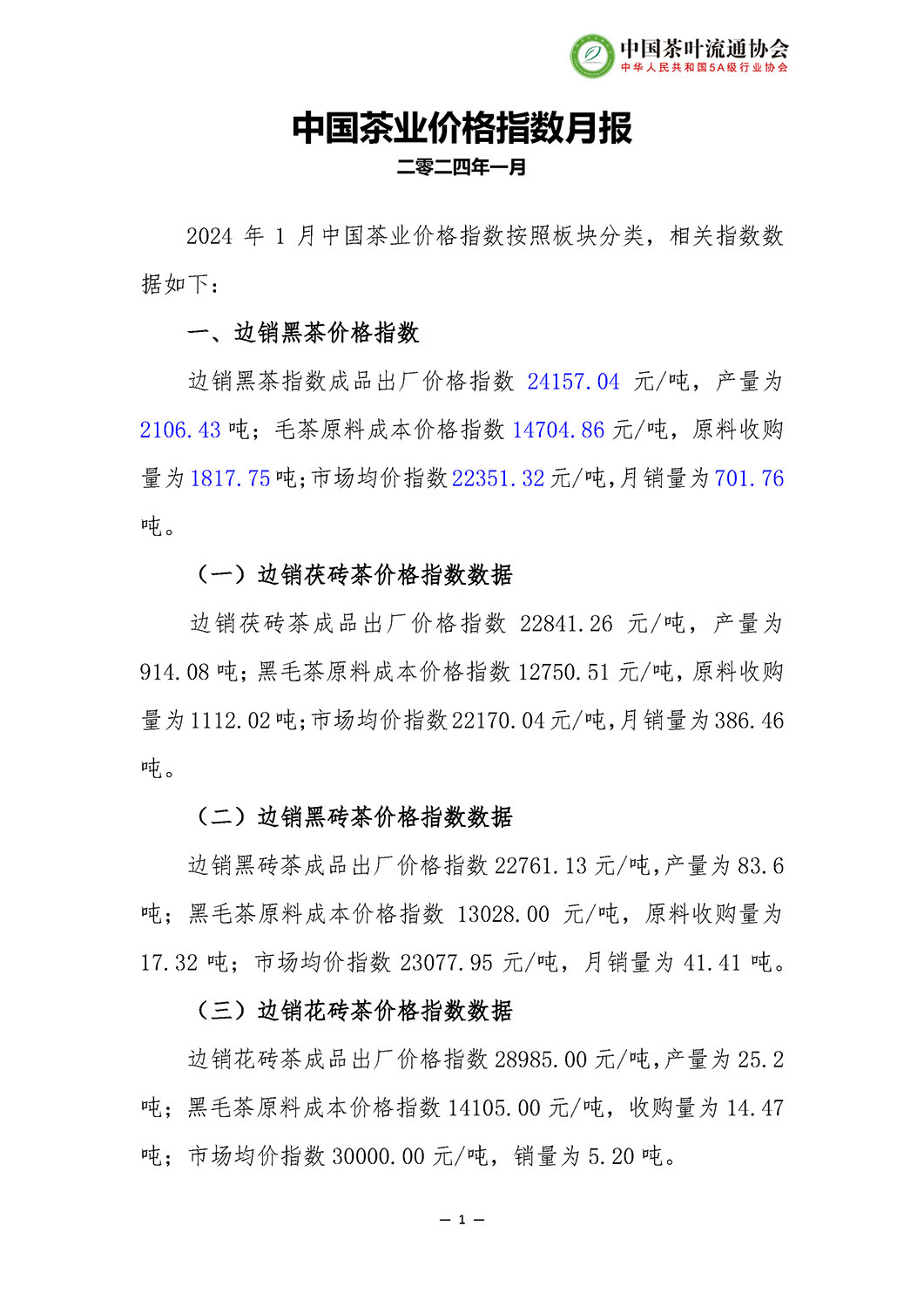 2024年01月中国茶业价格指数