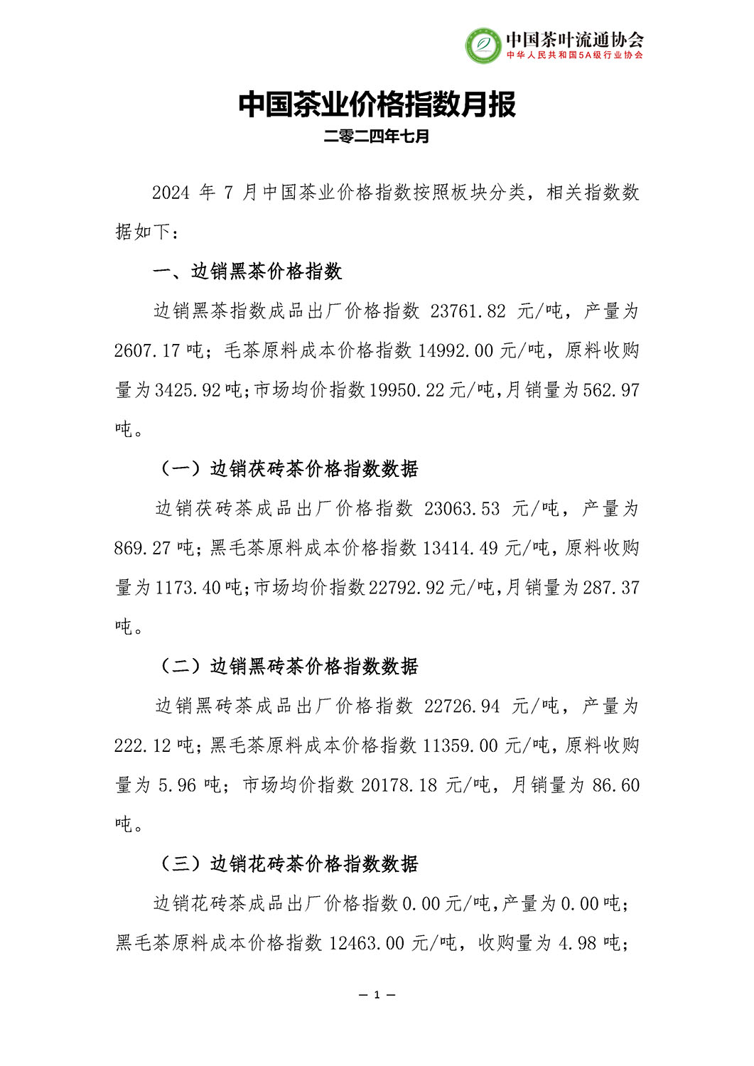 2024年07月中国茶业价格指数