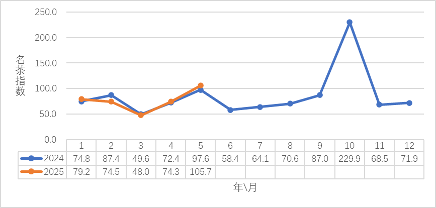 5月,茶都市场铁观音交易指数为105.7,比去年同期97.6上升8.3点。
