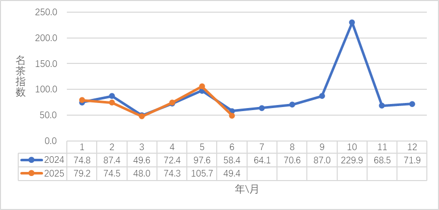 6月茶都市场铁观音交易指数为49.4,比去年同期58.4下降9.0点。
