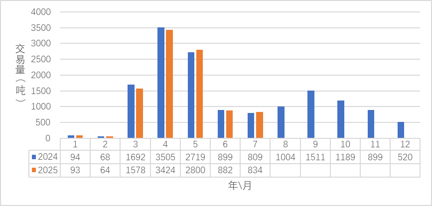2025年1-7月,中国茶市交易总量为9673.21吨,比去年同期9784.40吨减少1.14%,交易总额47.975亿元,比去年同期49.562亿元减少3.20%。