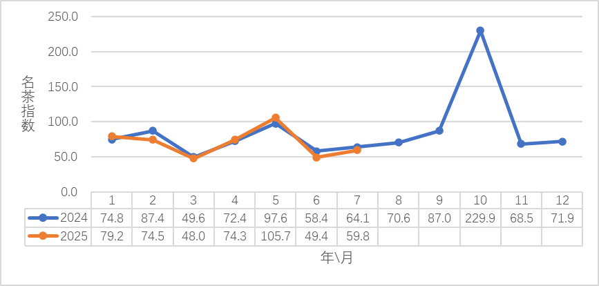 7月茶都市场铁观音指数为59.8,同比减少4.3。当月,受多轮台风天气影响,茶叶生产连续性较差,茶叶产量、品质受较大影响。