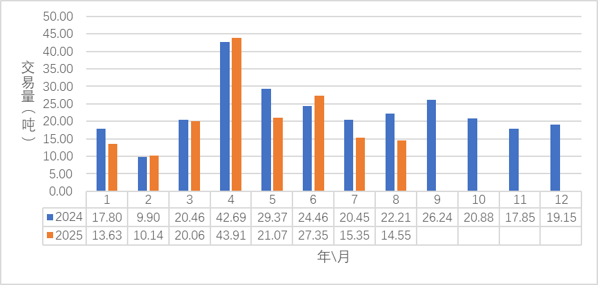 8月市场交易均价为1154.73元/千克,同比下降37.16%。当月市场交易额为1680.31万元,同比减少58.83%。