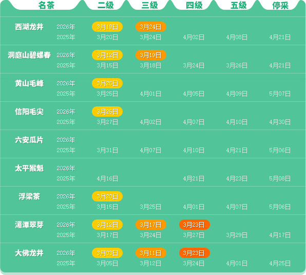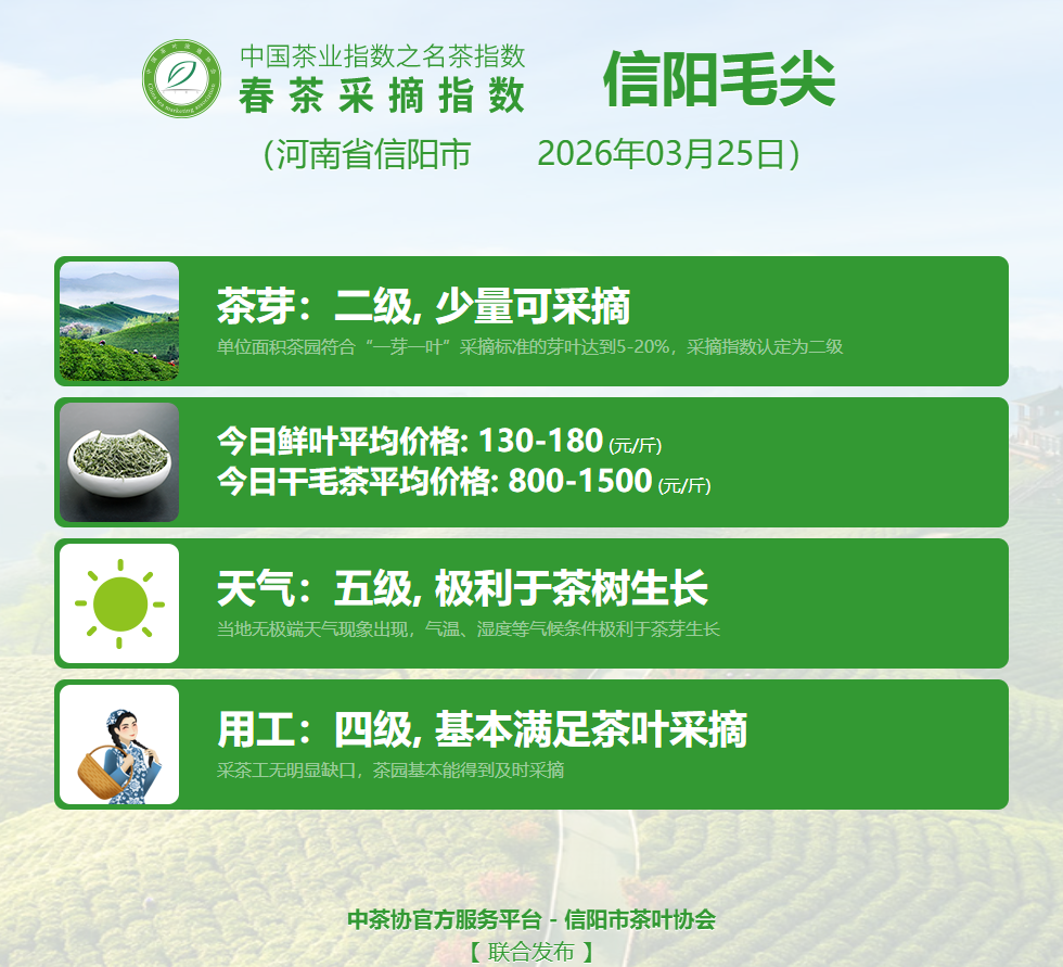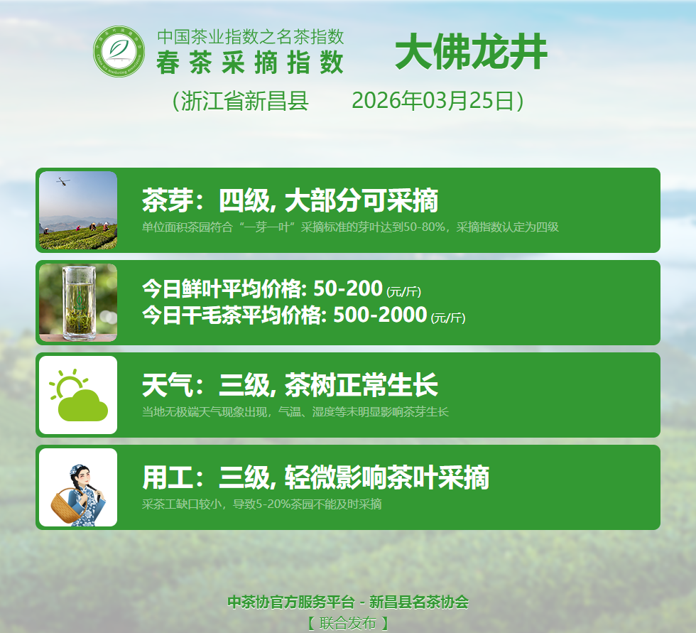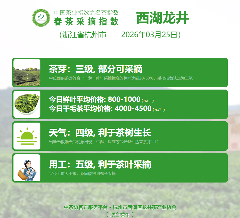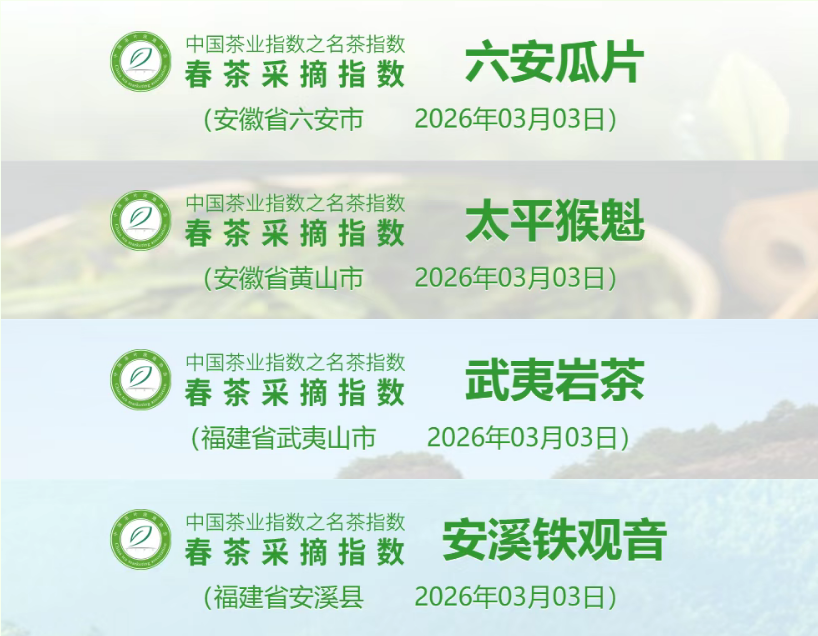 为引导广大茶叶消费者科学、安全、理性选购春茶,切实保护名优茶原产地生产者和广大消费者的利益,中国茶叶流通协会于2026年继续联合杭州市西湖区龙井茶产业协会等11大名优茶产区主管单位,共同发布中国茶业指数之名茶指数——春茶采摘指数,包括西湖龙井、洞庭山碧螺春、黄山毛峰、信阳毛尖、六安瓜片、太平猴魁、浮梁茶、湄潭翠芽、大佛龙井、武夷岩茶、安溪铁观音。