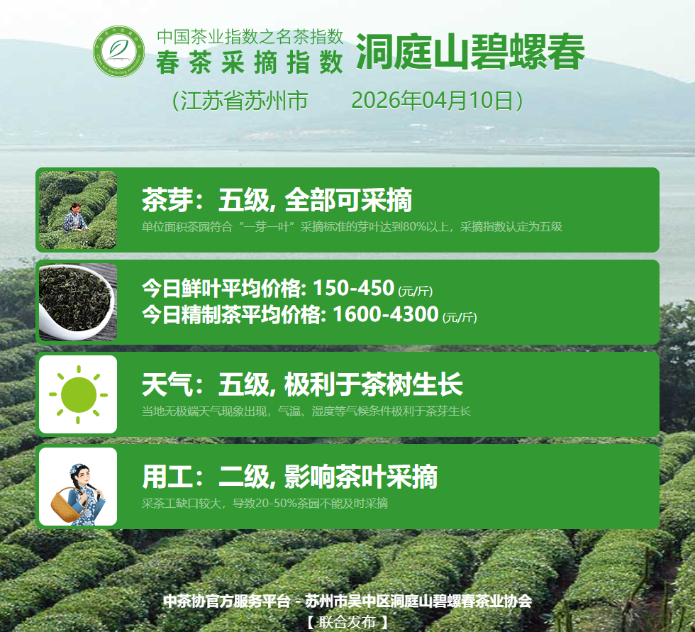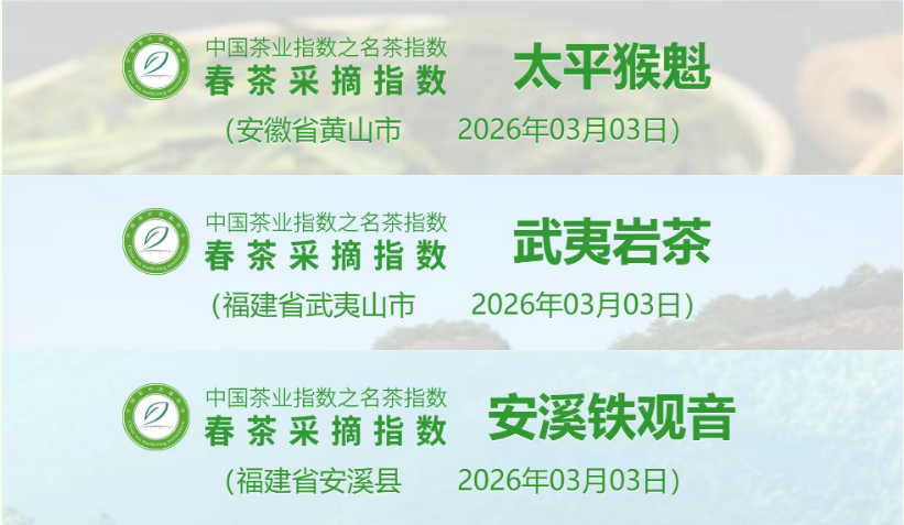 为引导广大茶叶消费者科学、安全、理性选购春茶,切实保护名优茶原产地生产者和广大消费者的利益,中国茶叶流通协会于2026年继续联合杭州市西湖区龙井茶产业协会等11大名优茶产区主管单位,共同发布中国茶业指数之名茶指数——春茶采摘指数,包括西湖龙井、洞庭山碧螺春、黄山毛峰、信阳毛尖、六安瓜片、太平猴魁、浮梁茶、湄潭翠芽、大佛龙井、武夷岩茶、安溪铁观音。
