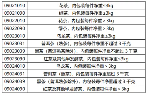 2020年12月,国务院关税税则委员会对茶叶类进出口税号进行了调整,新增黑茶出口税号类目,调整后茶叶进出口商品编码及商品名称信息如下:
