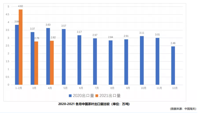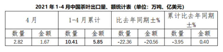 2021年1-4月,中国茶叶累计出口量为10.41万吨,同比减少3.95%,出口额为5.85亿美元,同比增长0.40%,1-4月出口均价为5.62美元/千克,比去年同期上涨4.54%。
