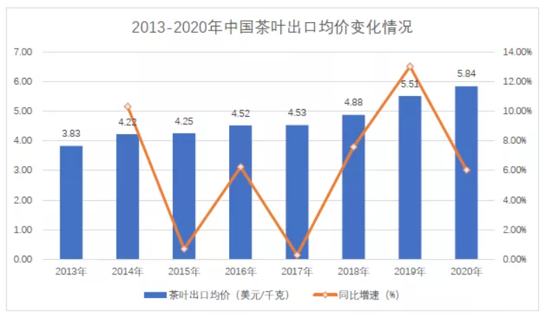 2020年1-12月,中国茶叶出口均价为5.84美元/千克,同比上涨0.33美元/千克,涨幅6.04%。2013年以来,茶叶出口均价持续增长,年均复合增长率为6.23%,接连突破4美元/千克、5美元/千克大关,照现有复合增速,2021年有望突破6美元/千克。
